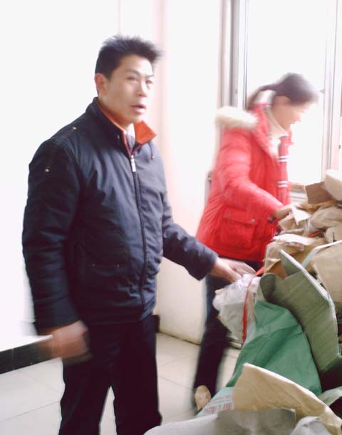 新学期上课的第一天,瑶湖校区计算机系的江泽霖班主任异常的忙碌。他和两个学生在教二栋3楼走廊休息处整理一大堆废纸。只见,他们将包装带和书包纸分开、又将它们整齐有序地堆放。原来,为了帮助班上丁一科、陈安龙这两名品学兼优的同学解决一点生活困难,江老师从昨天晚上开始,就在教学楼收集各班的书包纸,难怪有如此之多。包装带只能卖到3毛钱一斤,书包纸价格也很便宜,卖废纸的钱很少,但他把钱一点一滴都给了这两位同学。