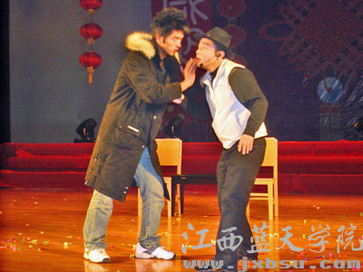 话剧《草船借箭》是本场晚会的一大亮点。商贸系学生会指导老师王勃扮演的鲁肃,滑稽自然,不但让我们看到商贸系学生的风采,更让我们看到了老师的风范。歌舞《洗衣歌》结束后,全体演员走到台下为辛苦一年的院领导、老师们献上了围巾,顿时,一股暖流在师生之间传递开来。