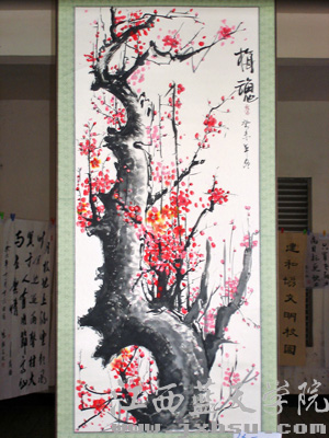 在展览现场,我们看到有一幅叫“梅魂”的作品引起不少同学的驻足观看,大家纷纷为它投票。据生活园区团委干部讲:这张由14栋符磊同学创作的作品有望夺得此次书画展绘画类作品的冠军。与“梅魂”相邻的另一幅水墨画“和谐与宁静”,同样惹眼。这幅画由06级新生王华明用了三天时间创作出来。他巧妙地把蓝天、白云、绿树、青山完美地结合在一起,给人以身临其境的感觉,方寸之间,张显智慧。