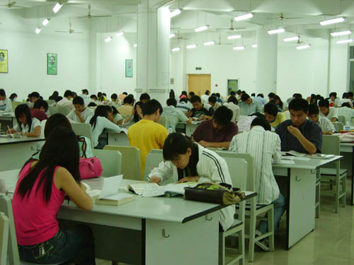临近期末,偌大的图书馆二楼自习室,从早到晚座无虚席、鸦雀无声。同学们忙于查找资料、摘抄笔记,只见笔尖在纸张上飞快地流淌。很多同学中午也不休息,饿了啃个面包,渴了喝口矿泉水,眼睛始终不离开书本,那专注的神情,让人感染到备考的紧张气氛。入夜,更是灯火辉煌、甚于白天。据了解,机械系、外语系的同学居多。
