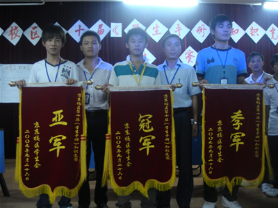 最后,经管系勇夺桂冠,机电系、数控系分别获得亚、季军,机械系获得优秀组织奖,决赛还产生三名优秀主持人,陈永生老师、汪俊老师分别为获奖代表队颁发锦旗,并留影纪念。