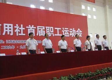 9月21日上午8时50分,江西省农村信用社首届职工运动会在我院体育馆隆重举行,江西省农村信用社理事长肖四如、主任孔发龙、省总工会陈文明副主席、省体育局副巡视员杜雅军及其他省信用社领导在我院于果董事长的陪同下参加了本此运动会开幕式。开幕式上我院作为承办方组织了欢快、活泼的表演节目,精彩的节目不时博得观众的阵阵掌声。本次运动会为期3天,运动赛事有篮球、羽毛球、乒乓球、网球、田径五个项目,共有300多位运动员参加以上赛事的角逐。
