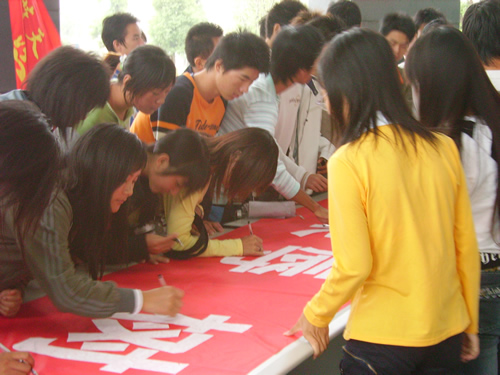一大早,图书馆工作人员就把几张书桌拼在一起,摆出了一条红色横幅,上面写着“读好书,知荣辱;树新风,促和谐。”第二届读书活动月在签名活动中拉开序幕。前来图书馆看书的同学们纷纷驻足并签下自己姓名。8:30,一支队伍来到图书馆门前,带队的同学高举着“计算机”系的大旗,以集体签名的方式立下誓言:在读书中创建学习型学院,在读书中构建和谐校园。