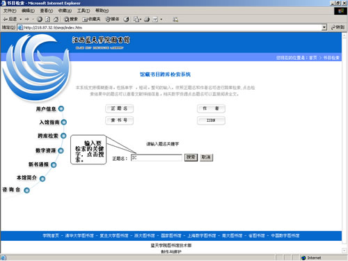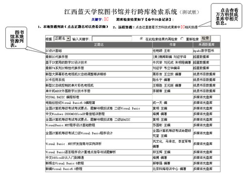 蓝天图书馆自主开发的,跨库检索平台,自试运行以来,极大的方便了读者检索图书馆的资源,受到了广泛的好评。9月12日,该平台又增加了新成员---------万方科技成果数据库。今后读者不但可以检索图书馆本地资源,还可以同步定位万方科技成果库的中的相关信息。