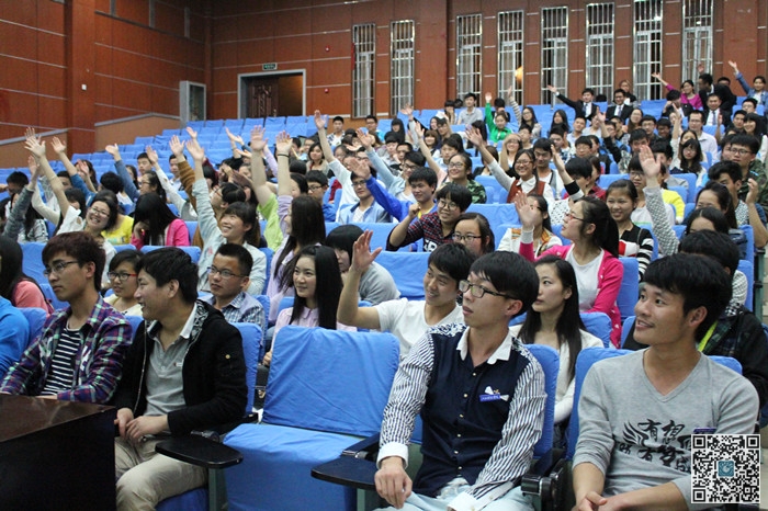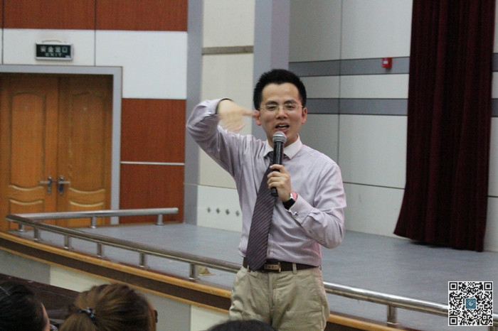 4月17日晚,英语协会在报告厅B厅举办了“引爆词汇”专题讲座。讲座由著名英语词汇研究者江民雷主讲。英语协会的全体干部和来自不同学院的二百余名同学聆听了讲座。江民雷结合自身经历,以幽默风趣的语言对英语四六级应试复习技巧进行了剖析,重点讲解了如何拆词巧背单词、如何提高单词记忆效率、如何提高听力能力,科学总结了单词组合的规律。他要求大家做到早晚坚持记单词,注意发音和词义、集中突破、反复记忆。在讲座现场,江民雷还邀请了他的朋友Kens调动现场气氛,与同学们积极互动,现场气氛热烈。