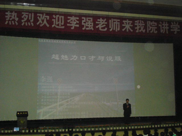 4月24日,深圳巨思特企业管理顾问有限公司董事长兼创意总监,杰出演讲家、成功学专家、营销策划专家、企业培训导师,享有“中国启智训练第一人”之美誉的李强先生在我院剧场进行《超魅力口才与说服》讲座。李强先生曾在大型外资企业担任职业经理人,后投身于咨询业。他已有7年的讲坛生涯,进行了近千场演讲培训,45余万接受过他培训和听过他演讲的学生遍及天涯海角……
