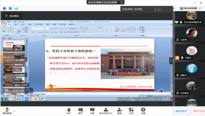 王玲玲副院长围绕《从“八个相统一”谈如何讲好思政课》这一主题,结合自己多年教学经验,和与会教师分享自己的教学心得与体会。她表示,上好思政课要坚持“八个相统一”,即思政课教学要做到坚持政治性和学理性相统一、价值性和知识性相统一、建设性和批判性相统一、理论性和实践性相统一、统一性和多样性相统一、主导性和主体性相统一、灌输性和启发性相统一、显性教育和隐性教育相统一。思政课教师要练就“不怕问、怕不问、见问则喜”的真本领,所讲的理论、观点、结论要经得起学生各种“为什么”的追问;要学习和实践马克思主义,着重研读经典、关注时政、加强研讨、打磨课件。