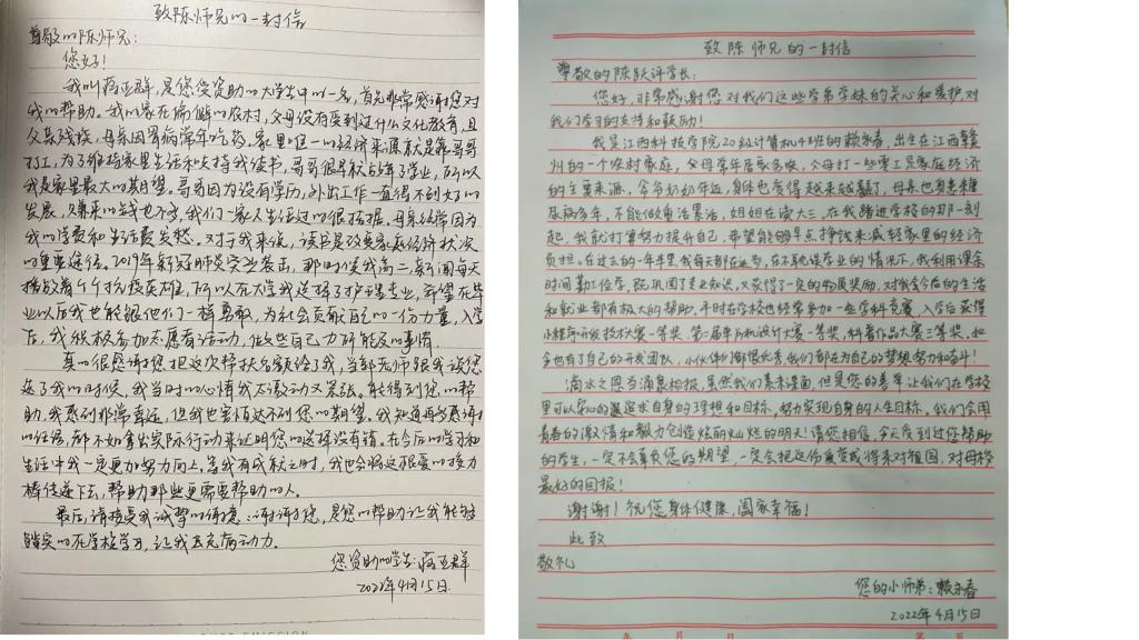 “谢谢您,是您的帮助让我能够踏实地在学校学习,让我充满动力。”“滴水之恩当涌泉相报,我会用青春的激情和毅力创造绚丽灿烂的明天!”疫情期间,学子们无法当面致谢,大家便用一封封手写信,表达了对陈跃评校友真挚的感谢之情。