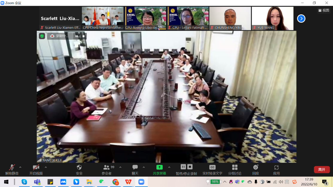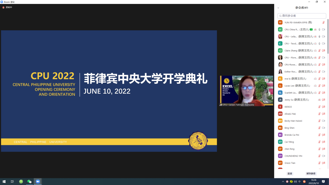 江科网讯(通讯员 汪卉)6月10日下午,菲律宾中央大学研究生院开学典礼通过ZOOM线上举行,我校成功申请为菲律宾中央大学博士研究生的教职工在行政北一楼会议室在线参加。菲律宾中央大学校长Teodoro C. Robles博士、学生事务副校长Esther Rose A. Romarate博士、研究生院院长Rowena M. Libo-on博士出席开学典礼。典礼由菲律宾中央大学国际事务办公室Leilani Fatimah L. Trompeta教授主持。