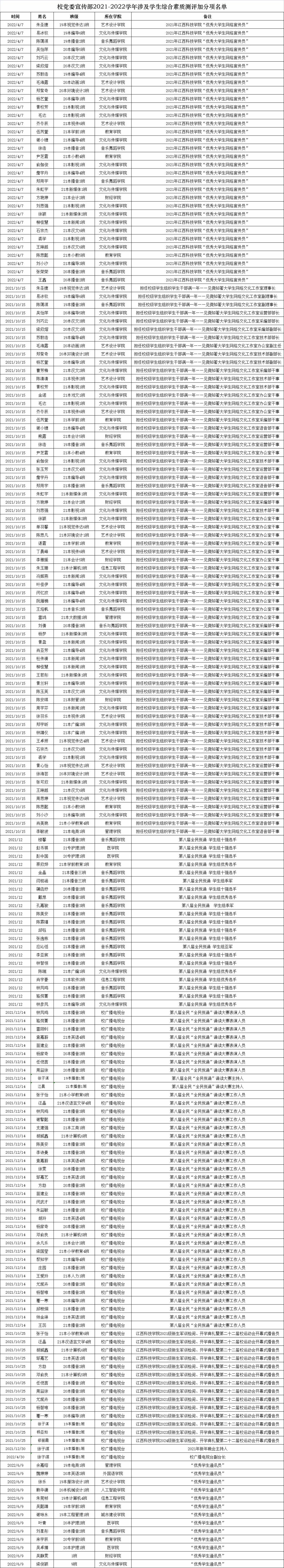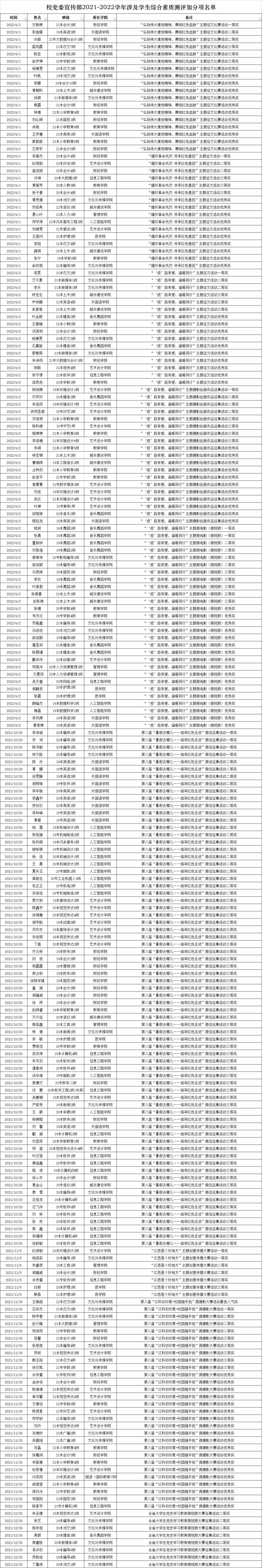 经个人申请,由宣传部审核、汇总提交学校学工处予以学生综合素质测评加分,现将名单予以公示,公示期为5日(2022年8月22日至2022年8月26日)。