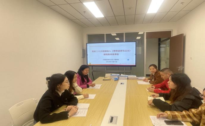 思想道德与法治教研室全体教师围绕如何更好将党的二十大精神融入《思想道德与法治》课程及教学科研重点、教学方式方法等展开研讨。大家认为,思政课教师要吃透党的二十大精神,认真学习、深刻领悟党的二十大报告中的新观点、新论断、新思想;要根据《思想道德与法治》这门课程的内容特点,实现党的二十大精神与教学内容的有效衔接;要以“大思政课”视野推动高校思政课改革创新,用学生听得进、听得懂的语言,以更易理解、更好把握的方式诠释党的二十大精神,把道理讲深、讲透、讲活,有效提升思政课凝心铸魂育人目标。