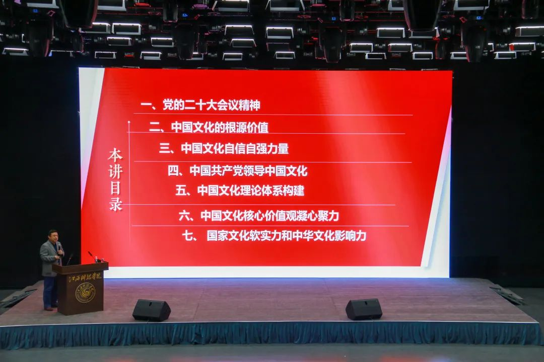 邹建中通过丰富的数据和实例,从“铸就社会主义文化新辉煌”“中国文化的根源”“中国文化的自信力量”“中国文化与中华民族伟大复兴”“中国文化理论体系构建”“中国文化核心价值观凝心聚力”、国家文化软实力和中华文化影响力”等方面进行深入阐述。他强调,文化是一个国家、一个民族的灵魂。只有夯实文化自信之根,铸就文化自信之魂,牢固文化自信之本,才能为民族伟大复兴提供精神支撑和文化力量。作为文化与传媒学院的学子,要主动担负起新的文化使命,紧跟时代步伐,主动将党的二十大精神融入到日常学习中去,在实践中进行文化创造,用自己的专业知识和素养讲好中国故事。