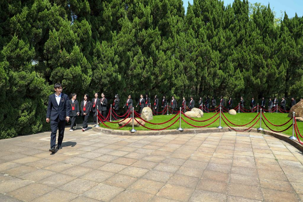 特色团课后,师生怀着崇敬的心情拾阶而上,在胡耀邦同志墓碑前全体肃立、神情庄重,向先烈敬献花篮、鞠躬致敬,并绕墓碑一周,缅怀先烈的丰功伟绩,祭奠先烈的不朽英魂。全体团员青年还在墓碑前重温入团誓词。