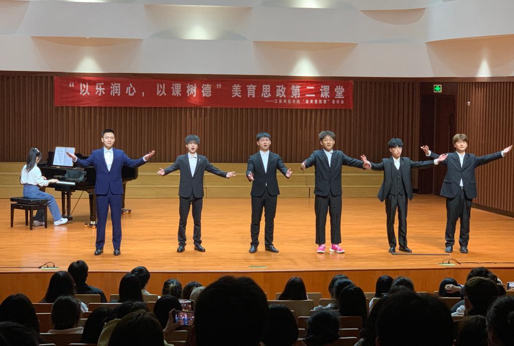 独唱、表演唱、合唱……音乐会上,该学院音乐学专业的优秀本科生们以丰富形式演绎了十四首音乐作品。其中,红色歌曲《三月桃花心中开》选自歌剧《长征》,充分体现了长征精神与爱国主义。《边疆泉水清又纯》表达出边疆军人想念亲人、思念家乡的心情,用优美旋律绘就了一幅军民互相爱戴、联防一条心的温馨图景。土家族民歌《山里女人喊太阳》唱出了土家族女性洒脱的性格;《纳西篝火阿哩哩》展现出纳西族人民古朴的民俗民风,两首歌曲共同描绘出在中央推行扶贫攻坚政策后山村人们幸福生活的场面。男生小合唱《童年》音乐风格轻松幽默,喜剧舞台表现形式引得全场观众笑声不断。音乐会尾声,同学们以一首《山河已无恙》表达了今天的青年人对英雄先烈们的深切怀念。