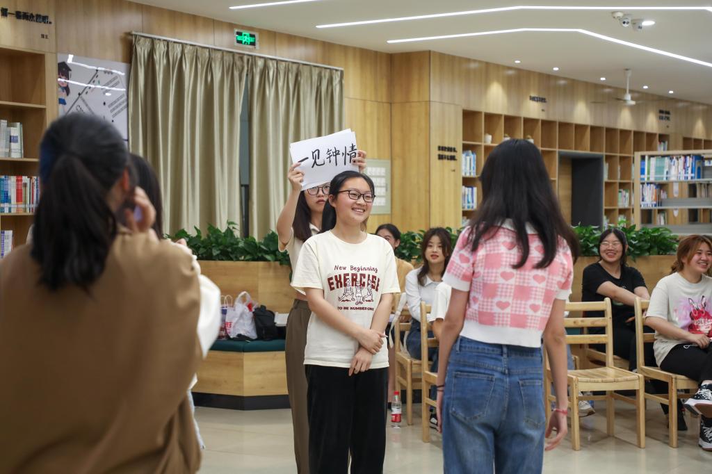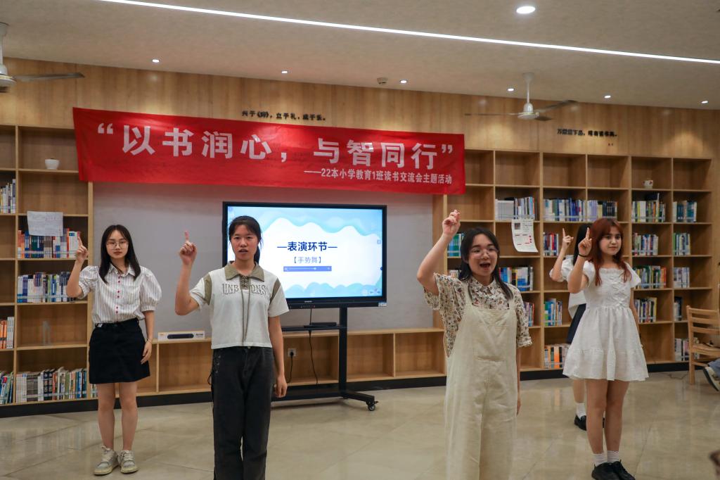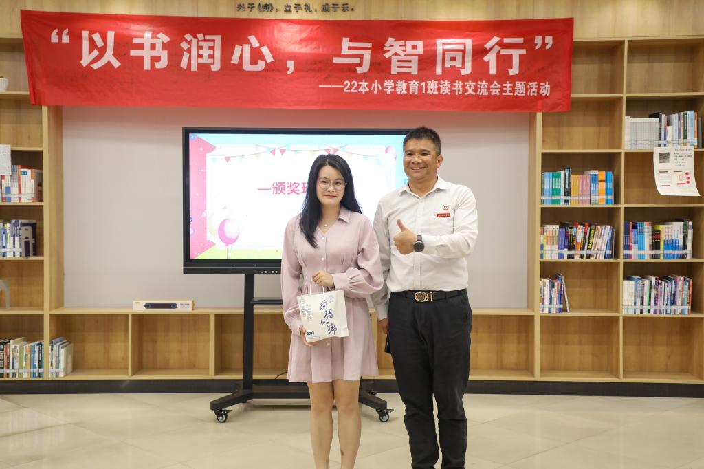 在读书分享环节,8位同学结合《爱的教育》《理想国》《牵到河边的马》《正面管教》等书籍畅谈阅读体会、收获。分享环节中海插入了手势舞表演、朗诵《致青年教师》、“你来比划,我来猜”游戏、古诗接龙游戏、幸运抽奖等,既让活动氛围更加欢快,又增强了同学之间的默契,还促进了师生之间的情感交流。