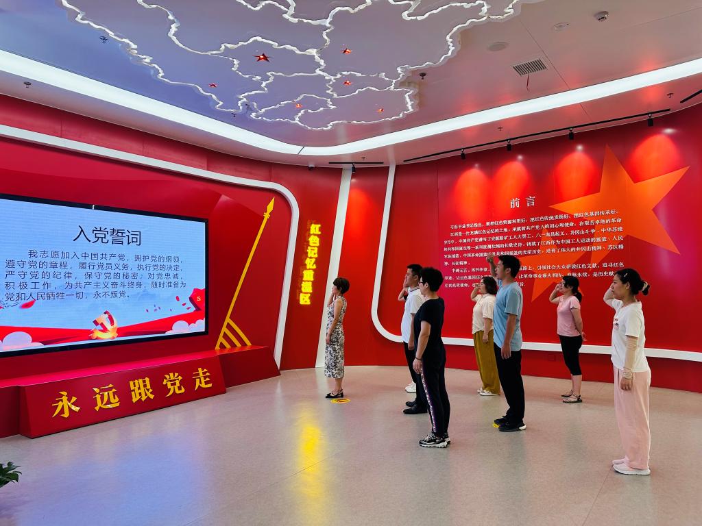 “我志愿加入中国共产党,拥护党的纲领,遵守党的章程……”在红色图书馆内,机关第四党支部成员集体重温了入党誓词,表达对党的忠诚和对祖国的热爱。随后在讲解员的带领下,成员们通过阅读场馆内红色文献、观看球幕影院影片《星火战歌》、VR军事体验、听旋律猜红歌等一系列活动全景式追寻红色足迹,感受江西深厚红色文化,接受红色文化洗礼。