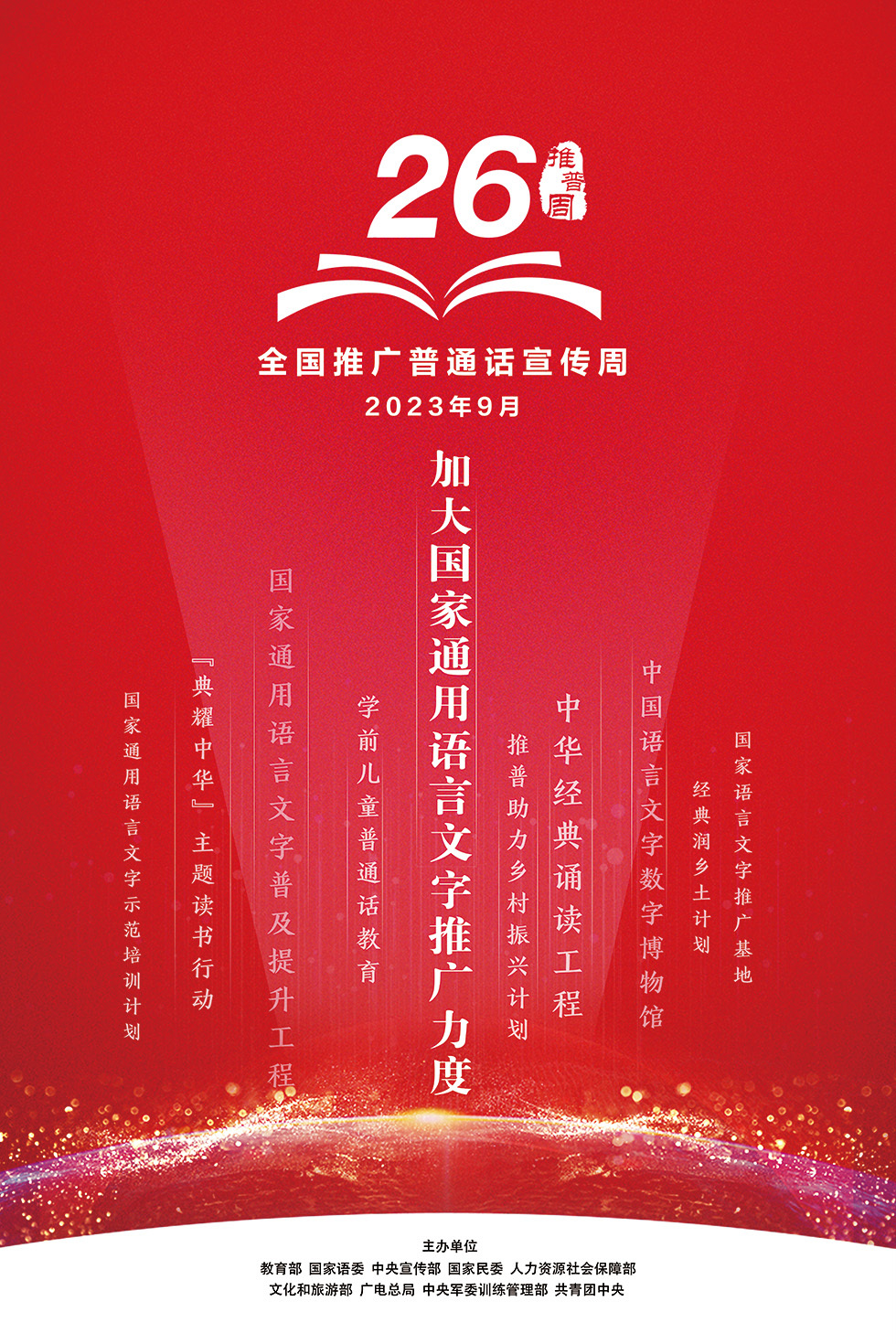 经国务院批准,自1998年起,每年9月第三周为全国推广普通话宣传周(简称推普周)。今年是第26届推普周,主题为“推广普通话,奋进新征程”。