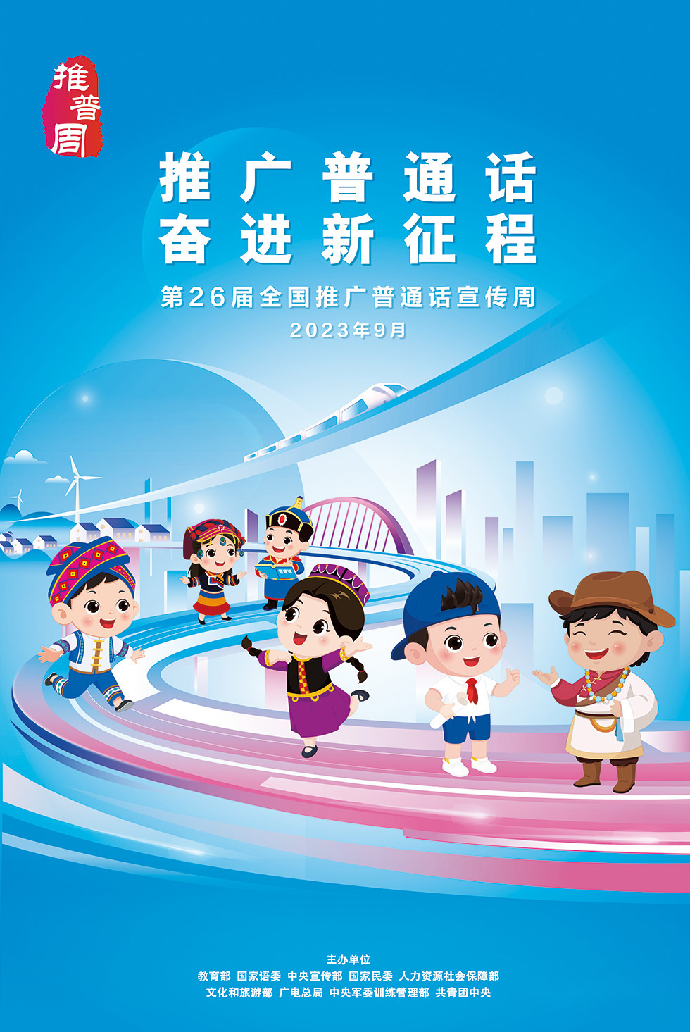海报二,以本届推普周主题为设计思路,通过汉族、蒙古族、藏族、维吾尔族、彝族、壮族等卡通人物形象,展现在新征程上中华儿女共同成长、共学普通话、迈向现代化。