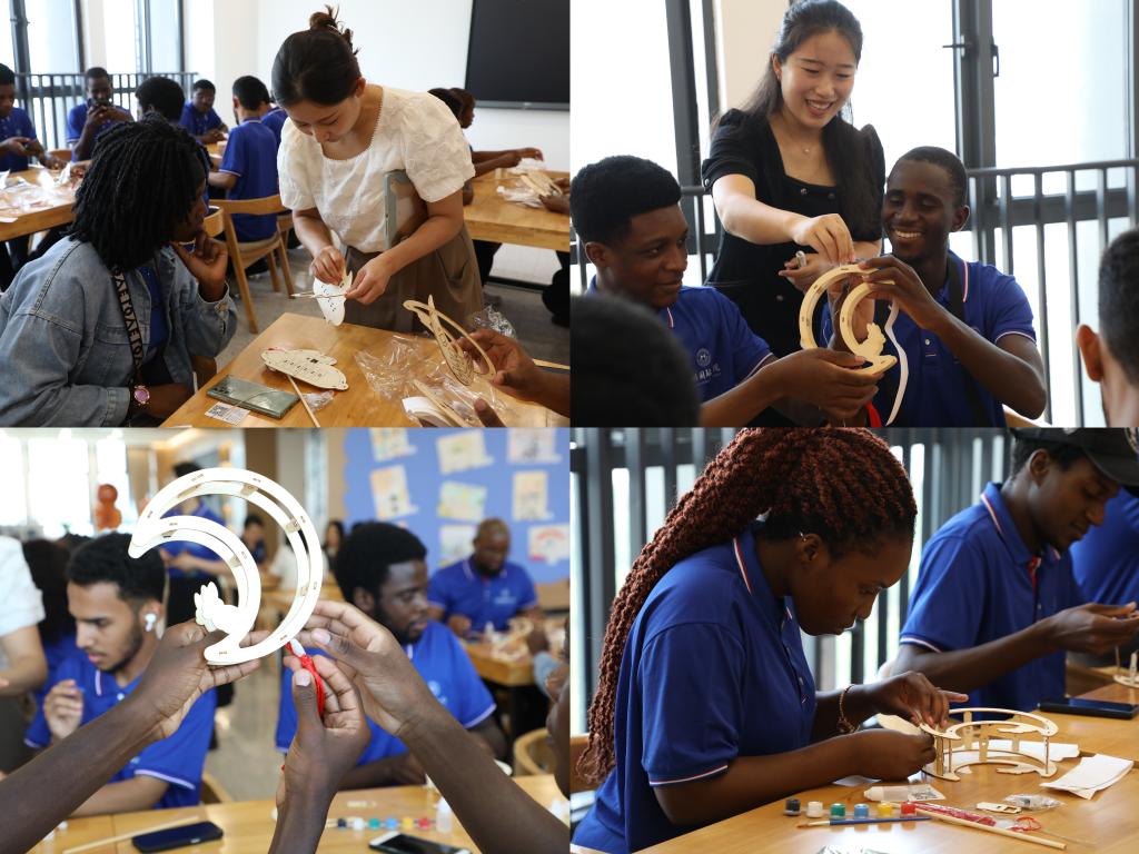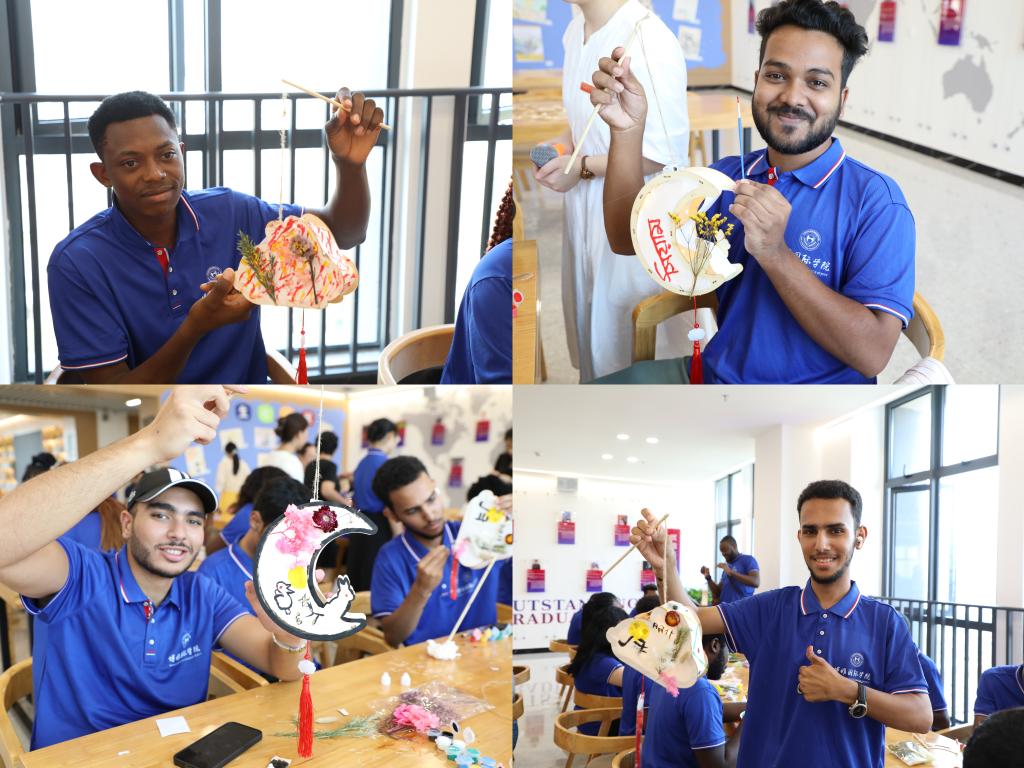 手工制作月兔灯环节,教育学院的老师们耐心指导,现场其乐融融、热闹非凡。从搭建月兔灯框架,到DIY各种有趣图案,留学生们兴致盎然,专心致志,乐在其中。他们有的认真写着汉字,有的画下月兔的形象,展现出对中国中秋传统文化的浓厚兴趣。其中,来自也门的学生哈什在月兔灯上画下了有中国国旗和也门国旗的元素,表达了对两国友好关系的美好祝福。