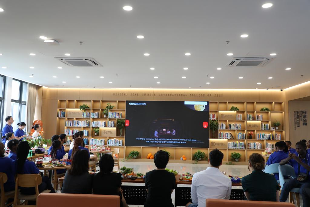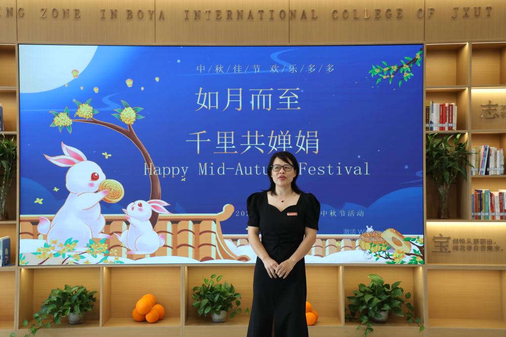 江科网讯(通讯员 刘盼)为了让留学生沉浸式体验中国的中秋文化,9月26日下午,博雅国际学院在J19栋十楼开放空间举办了以“如‘月’而至,千里共婵娟”为主题的留学生中秋文化体验活动。该学院常务副院长熊燕、外事副院长曹穗蓉同外教、留学生一道参加活动。