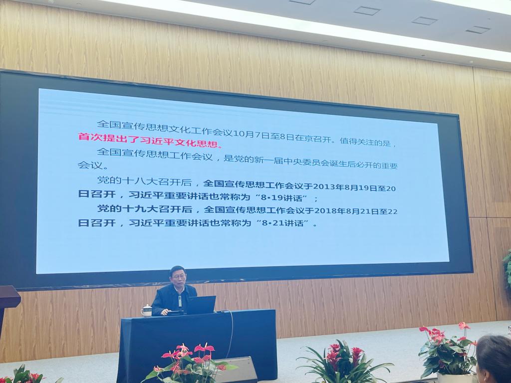 胡伯项教授以“深入学习领会习近平文化思想,谱写中华民族现代文明新华章”为主题,从习近平文化思想形成的时代背景、习近平文化思想的丰富内涵、谱写中华民族现代文明新华章的行动指南三个方面展开论述。他指出,习近平文化思想高屋建瓴、视野宏阔、内涵丰富、思想深刻,要深入学习领会习近平文化思想蕴含的丰富内涵。作为新时代青年,要坚定文化自信,践行社会主义核心价值观,推动中华优秀传统文化保护传承,秉持开朗开放包容的心态,坚持守正创新,真正学懂弄通习近平文化思想,担负起新的文化使命。
