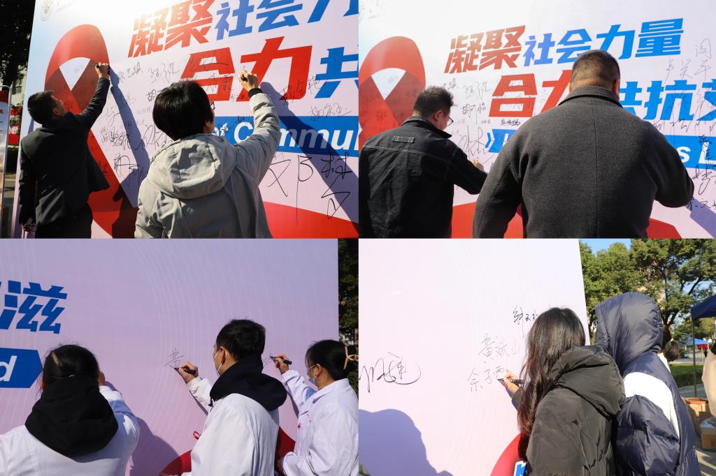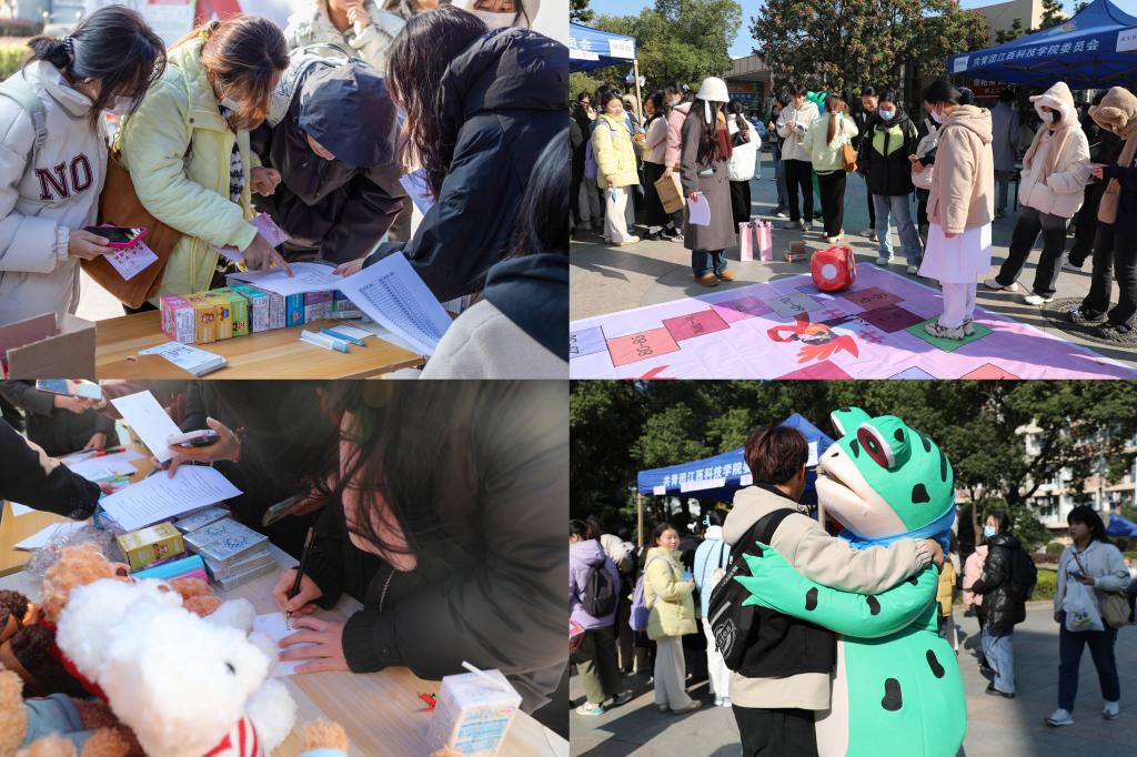 活动现场,工作人员积极引导师生观看手抄报、佩戴红丝带、签名并分发宣传手册,提供咨询问诊,提高大家对艾滋病的认识,增强自我保护意识。“艾滋病的传播方式是什么?”“艾滋病潜伏期多长?期间有什么症状?”现场还通过竞速答题、掷骰子问答、扎气球答题赢奖品的方式吸引大家参与竞答,加强对艾滋病综合防控知识的教育。现场师生踊跃参加,自觉排起长长的队。工作人员还鼓励大家拥抱“艾滋病感染者”青蛙偶,希望大家对艾滋病有科学的认识,反对歧视、共同行动。