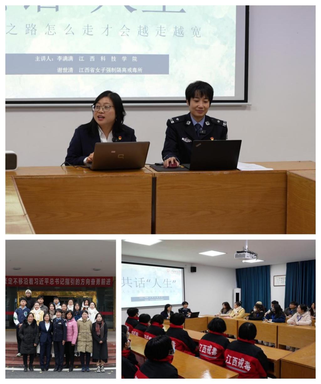 12月17日,我校青年禁毒志愿者协会学生代表在李满满老师带领下,来到江西省女子强制隔离戒毒所,与这里的学员一起参加了一堂特殊的“双师同台”思政课。李满满老师与戒毒所教育矫正中心政治教导员谢世清,以“人生之路怎么走才会越走越宽”为主题,与同学们和学员们一起共话“人生”。李满满老师在课上引用伟人的青年事迹来激励同学要在实践中寻找自我,找到合适的人生目标,树立远大理想,成大事,在时代中为社会建设贡献自己的力量。谢警官与学员们分享真实事例,鼓励她们要重振对生活的勇气。同学们和学员们也在课上分享自己的困惑与迷茫。同学们纷纷表示,在戒毒所看到同龄人为人生道路走歪付出沉重代价,使自己认识到必须远离不良诱惑,积极参与社会志愿服务,在帮助他人的同时坚定理想信念,将人生道路越走越宽。
