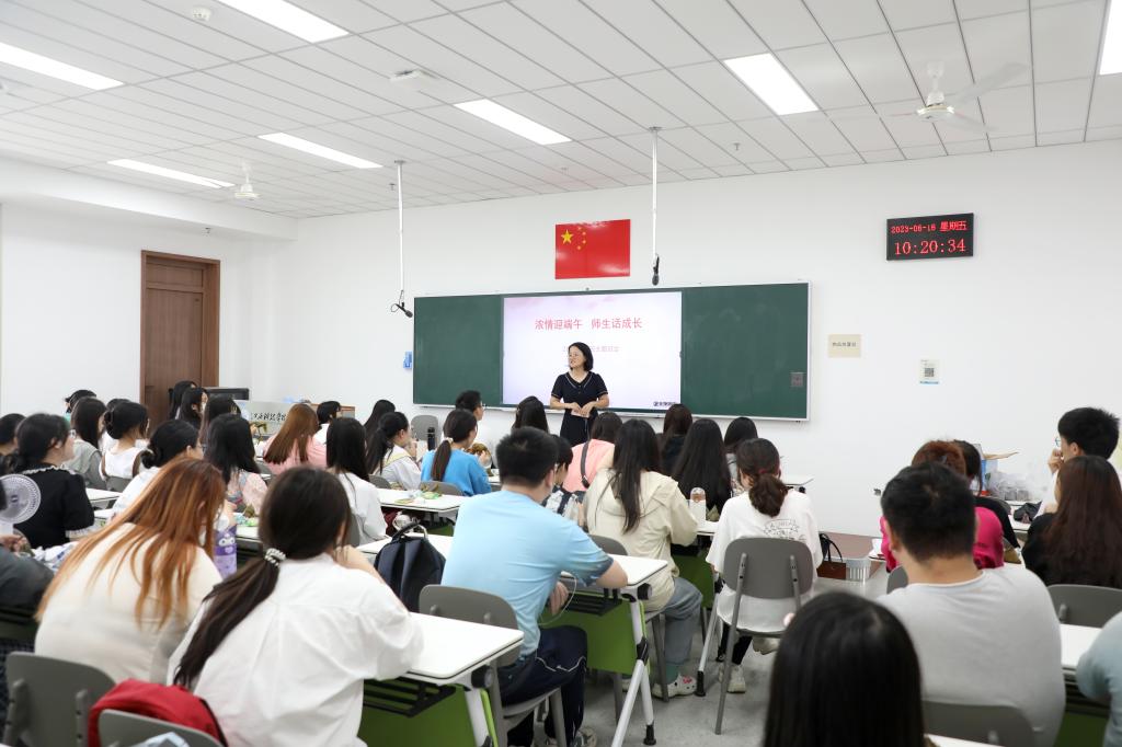 “端午节的名称在中国所有传统节日当中叫法最多,高达二十多个,龙舟节、重午节、端阳节、端五节、重五节……”郭月芳端午历史渊源、节日民俗与活动、相关传说与故事以及端午相关文学记载等方面对端午节作了详细介绍。她表示,同学们生在红旗下,长在春风里,正处在最好的时代、最好的年华,是生逢其时的一代,是大有作为的一代。大家要从厚重的中华优秀传统文化中汲取道德营养、文化精髓和精神力量,让“文化自信”扎根在心中、流淌在血脉;要在弘扬中华优秀传统文化中涵养家国情怀,深入学习理解其所蕴含的道德精神、价值理念和思维方式,注重个人的品德培养和本领提升,树立崇高的价值追求,涵养家国情怀,增强做中国人的志气、骨气、底气。
