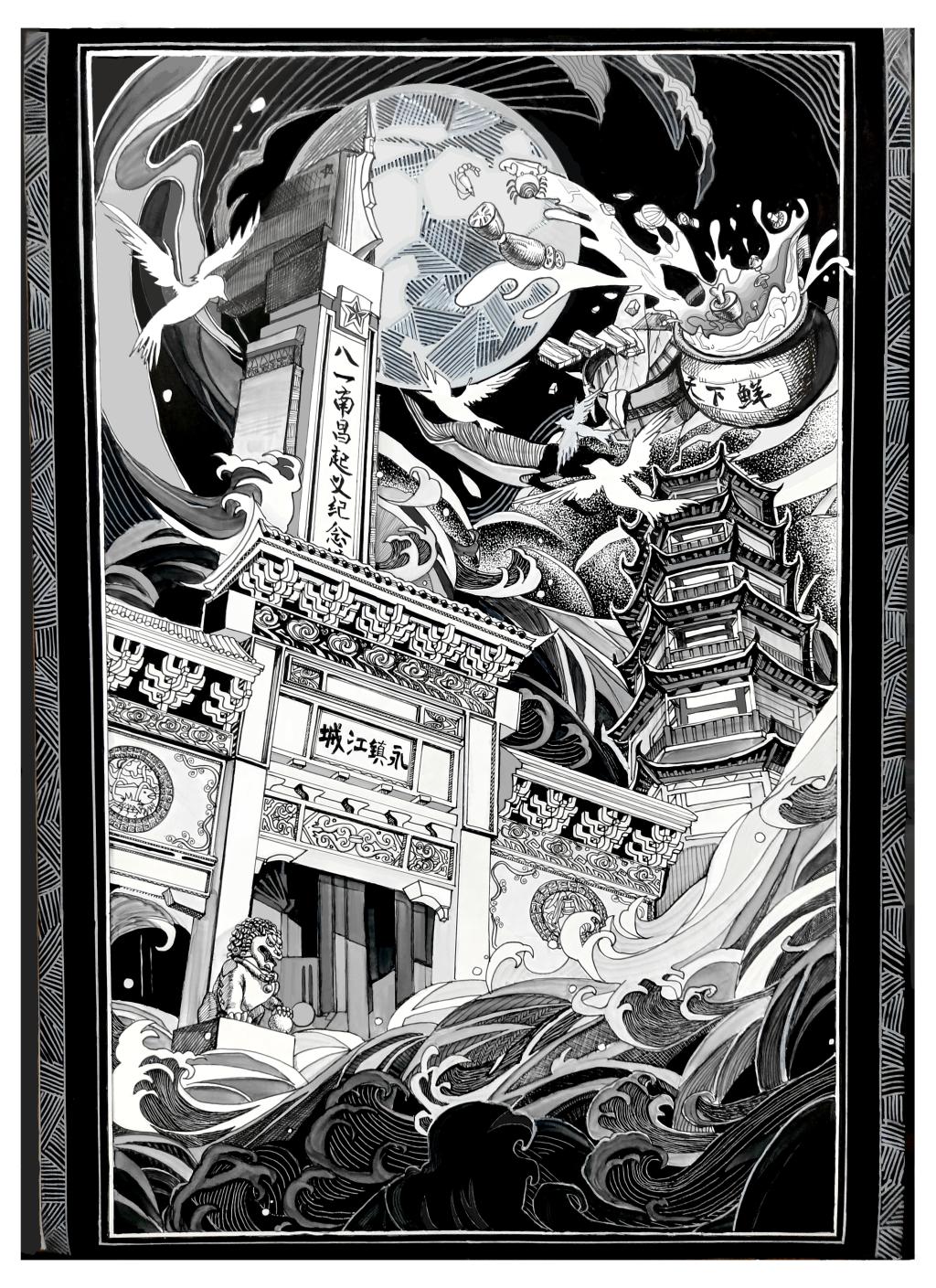 作品简介:这幅画主要描绘了八一南昌起义纪念碑等具有革命精神的特色景物。大浪滚滚向前奔腾,贯穿整幅画面,时问的波涛汹涌澎湃,不停向前,一代又一代炎黄子孙在时间的洪流中不断锤炼其精神和意志,不忘初心,牢记使命,不负当下,勇往直前,行而不辍,未来可期!