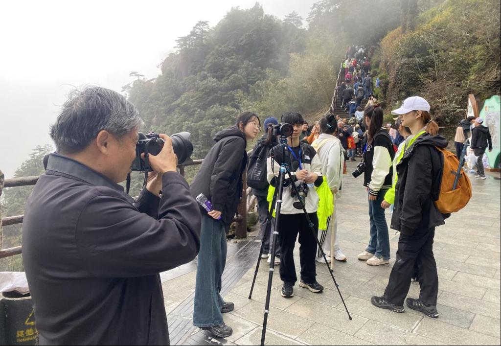 期间,工作室师生代表参加开幕式、全国旅游摄影展和摄影器材体验、全国旅游摄影发展论坛、无人机航拍交流专题讲座等内容丰富的系列活动。师生还跟随熊盛文教授、李云惠老师等摄影家们前往三清山景区进行实地创作采风。据三清山风景管委会有关负责人介绍,江科摄影工作室的大学生,是三清山风景区开放三十年来最年轻的一支摄影团队。文化与传媒学院的金楠老师表示,这是一次展示自我、交流学习的难得机会,这种跨地域、跨领域、跨年龄的交流,不仅拓宽了专业视野,也激发了他们的创作灵感和热情。22级影视摄影与制作专业的许乐怡同学则谈道,这次实践活动令大家受益匪浅,老师们在现场手把手指导如何构图、如何运用光线、如何捕捉瞬间,通过镜头更加深入地了解江西的自然风光和人文历史,感受这片土地的魅力和活力。