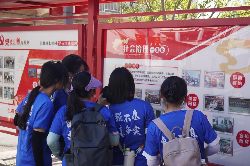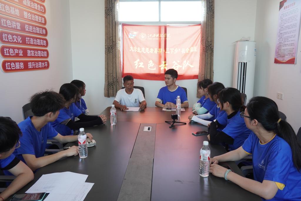 在七峰村村委会,七峰村党支部书记何茂火为红色云谷队介绍当地红色文化。来到村委会公告板前,一行行文字,一幅幅图片,无声地诉说着乡村的变迁与成长。