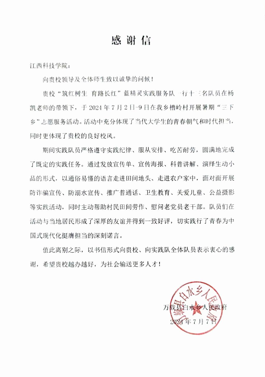 在本次暑期“三下乡”社会实践活动中,实践队员们在红色文化里汲取力量,坚定传承信念;在理论宣讲中普及知识,助力乡村振兴;在志愿服务中传递温暖,彰显青春担当;在乡村振兴中走访调研,了解地方实际。“三下乡”暑期社会实践活动已步入尾声,但志愿活动的脚步不会停息。他们仍将继续在志愿服务的道路上砥砺前行,前往党和祖国真正需要的地方绽放“青春之花”,为更多的人送去帮助和关爱。