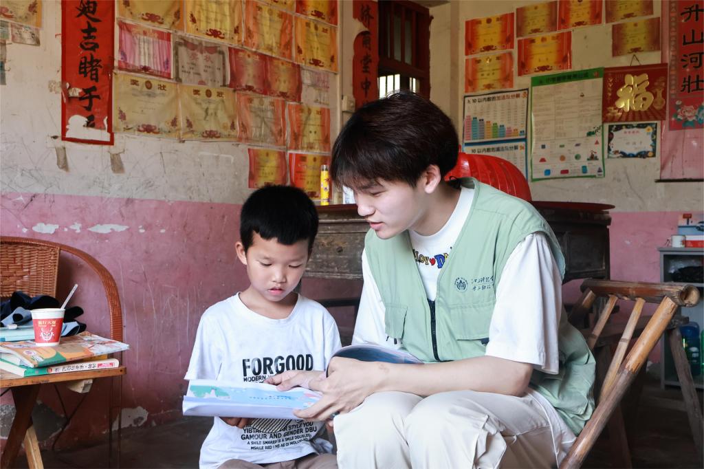 以“一次微型课堂”播撒知识种子助力成长。为引导村民在日常生活中养成说普通话的习惯。队员们深入槽岭村党员活动站,通过普通话推广微课堂,以“唱红歌、颂红诗、画红心”等特色形式,激发村民的学习兴趣与爱国热情。同时,他们深入村民家中、农间地头,结合当地文化特色,以唠家常的方式与村民进行亲切交流,用普通话搭建起沟通的桥梁。在课堂上大家用标准的普通话高喊“我爱中国!”让人为之震撼。