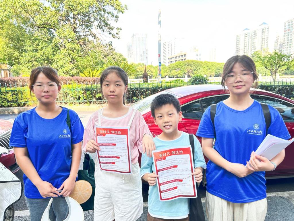随着气温升高,为做好暑期安全教育工作,保障青少年的生命安全,提高防溺水安全意识,团队在仙女湖借用真实案例、你问我答等通俗易懂的方式,运用生动的图片、真实案例和浅显易懂的语言,向小朋友们详尽介绍溺水的严重危害、常见原因及预防措施,并且介绍遇险时的基本自救与互救技巧,以及如何正确呼救和报警。为响应国家加强法治建设和推进乡村振兴的号召,全面推进科学立法、严格执法、公正司法、全民守法氛围的形成,营造全民“学法、懂法、用法”的良好氛围,增强渝水区区民的法律意识,队员们还自制普法宣传单,走上街道用通俗易懂的语言进行普法宣传教育工作。