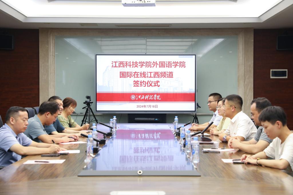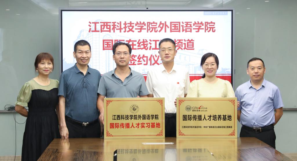 江科网讯(通讯员 戴睿)7月19日,外国语学院与国际在线江西频道共同签署校企合作协议,共建国际传播实习实践基地。副校长吕文威、国际在线江西频道负责人王朝中出席仪式。外国语学院院长李君主持仪式。国际在线地方部副主任李华领、江西频道总编辑刘华、江西频道综合部主任王厚萍、江西频道影视中心总监魏才江,我校继续教育学院副院长傅长文、外国语学院党委书记路丕军等参加仪式。