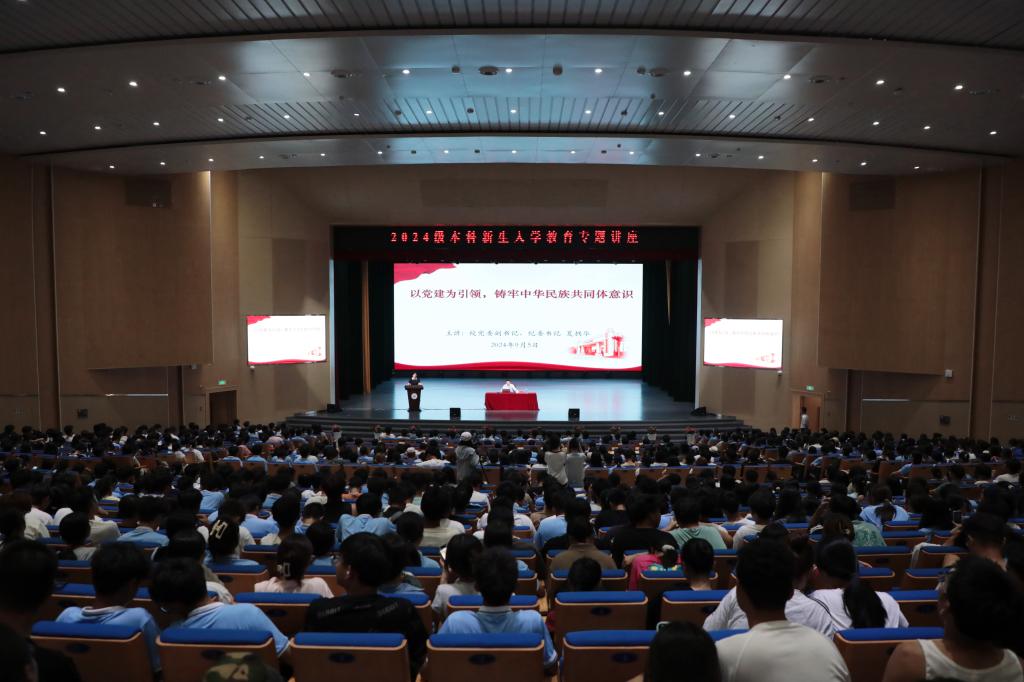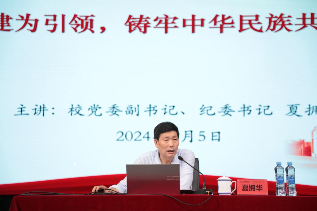 江科网讯(通讯员 唐喜龙 记者 杨泳慧)9月5日,校党委副书记、纪委书记夏拥华深入新生群体以《以党建引领 铸牢中华民族共同体意识》为主题,为同学们讲授“开学第一课”,把民族团结进步的种子厚植新生心中,引导新生“扣好大学第一粒扣子”。
