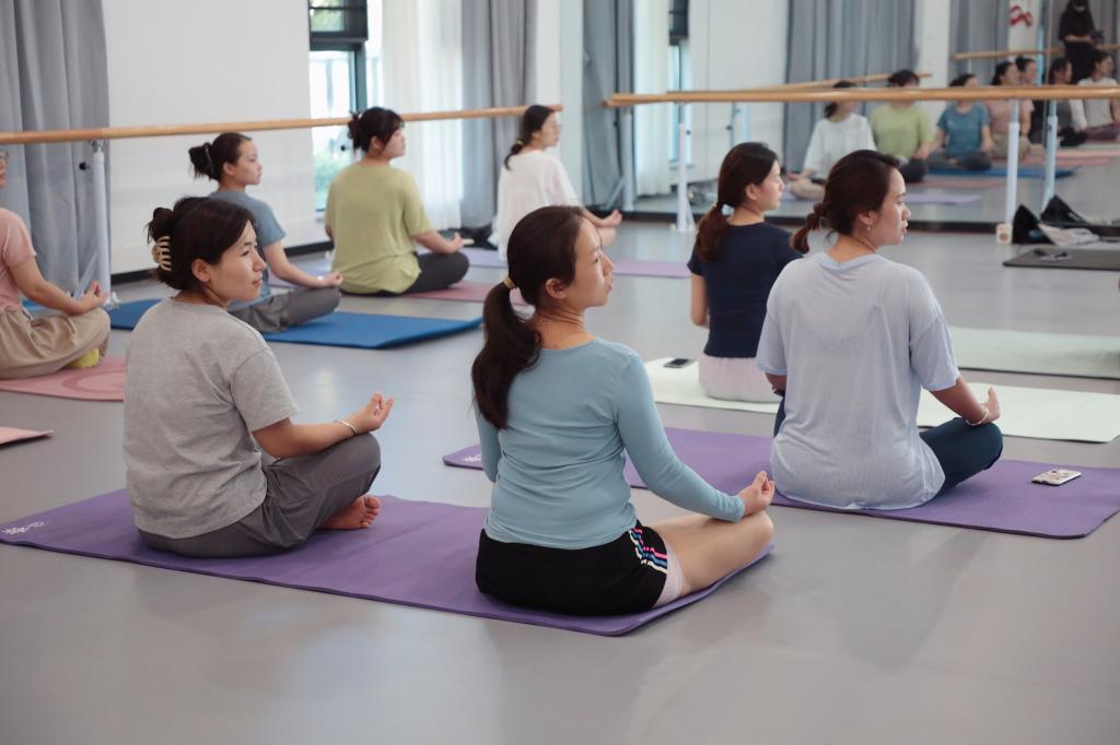 “调整呼吸、伸展手臂、拉伸前屈……”伴随着舒缓的轻音乐,在教练的指导下,大家时而曲腿盘坐,时而屈曲拉伸。针对教师长期伏案工作的特点,课堂上还有针对性地加入了一些改善肩关节和颈椎的体式,大家尽情舒展身体、放松关节、舒展肩颈,寻找内心的平静和力量。