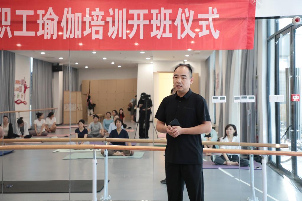 校工会副主席刘国安在开班仪式上致辞,希望大家珍惜机会,在教练的带领下坚持练习,通过瑜伽培训陶冶情操、保持活力、静心养性,进一步提升身体健康意识,培养坚韧进取品格,积极地应对工作和生活中的压力和挑战。