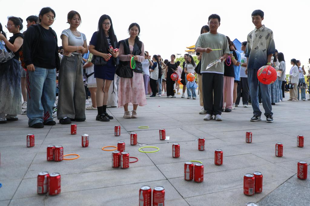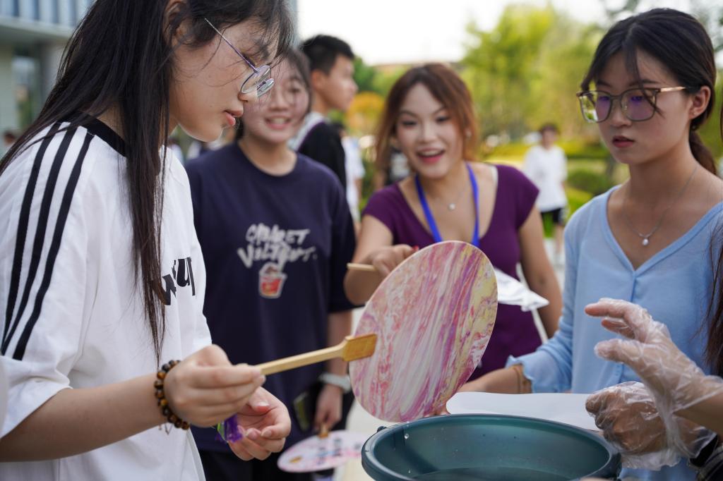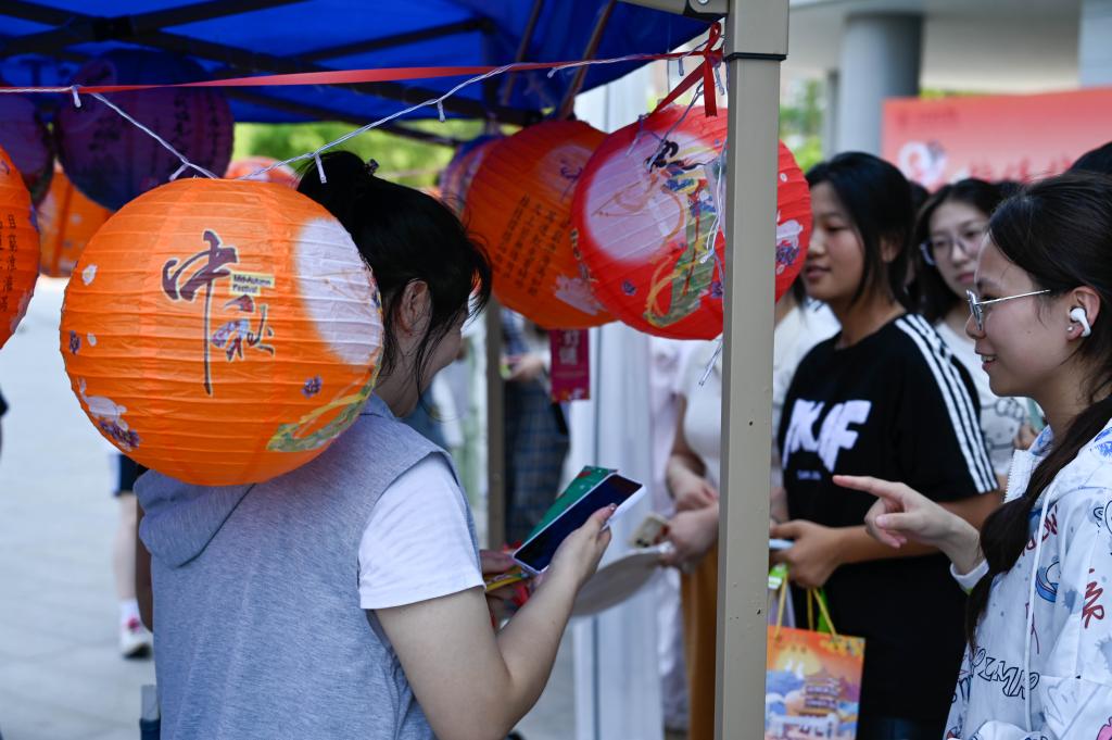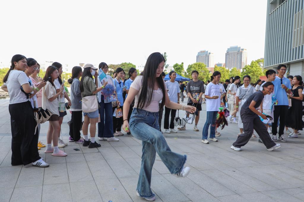 布节日盛景,玩趣味游戏,沉浸式体验中华文化之美。本次活动以打卡的形式开展,设置了踢毽子、非遗漆扇、诗词飞花令、猜灯谜、套圈、吹乒乓球等精彩有趣的环节,打造“可观、可玩”的沉浸式互动体验,让同学们收获节日快乐的同时,更加深对中华传统文化的热爱。在这片被欢乐气氛笼罩的活动中,每一个角落都藏着惊喜与欢乐。同学们凭打卡手环可参与各区域点位互动游戏并获得相应奖品。活动现场人声鼎沸,热闹非凡,欢呼声、鼓掌声,一浪高过一浪。