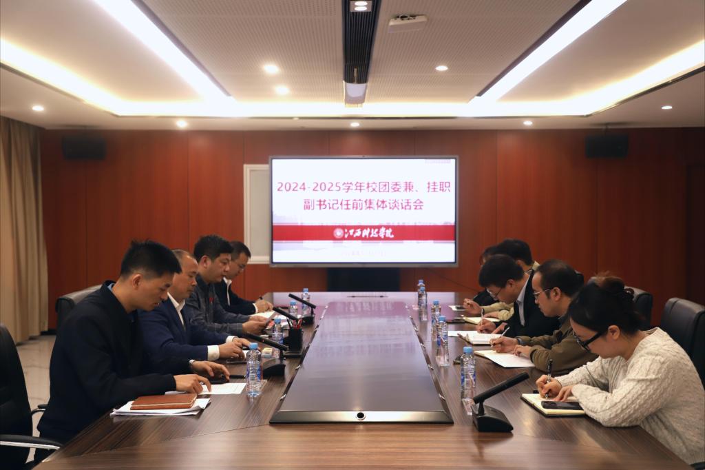 江科网讯(通讯员 吴双)11月13日上午,我校在行政南楼第五会议室举行2024-2025学年校团委兼、挂职副书记任前集体谈话会。校党委副书记、副校长闵桂林出席并讲话,组织部部长谢振林宣读《关于江西科技学院共青团干部任免职的通知》,团委书记马孙亮主持会议。