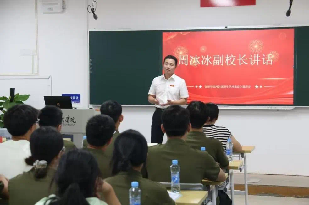 “君不见,黄河之水天上来,奔流到海不复回……”互动交流结束后,周冰冰副校长带领同学们朗诵《将进酒》,鼓励大家做任何事情都要久久为功。他还进一步分享道,学风建设反映了学校、学院、班级的治学精神和学生的学习状态。班干部要充分发挥榜样的引领作用,引导其他同学在学习态度、学习目的、学习规法、学习氛围上做表率;班级全体同学要发扬“踏实肯学”的求学之风,崇尚“奉献大爱”的教学之风,秉承“团结求实,创新奋进”的治学之风。最后,他勉励班级同学树立远大的人生理想,养成良好的学习和生活习惯,勤于学习,勇于实践,努力做优良学风的倡导者和实践者,争做优良学风的表率和楷模,成长为德智体美劳全面发展的社会主义建设者和接班人。