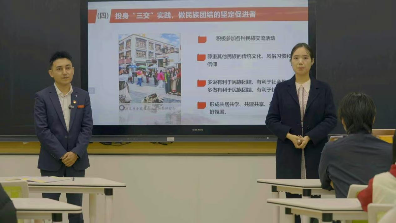 “全国民族团结进步模范个人”米拉迪力,围绕“专题四:促进民族团结”教学主题,声情并茂地分享他在江西学习、工作、生活的十余年中,为民族团结进步事业所做的生动事迹,同时也希望新时代的同学们要像爱护自己的眼睛一样维护民族团结,像爱护自己的生命一样维护社会稳定。