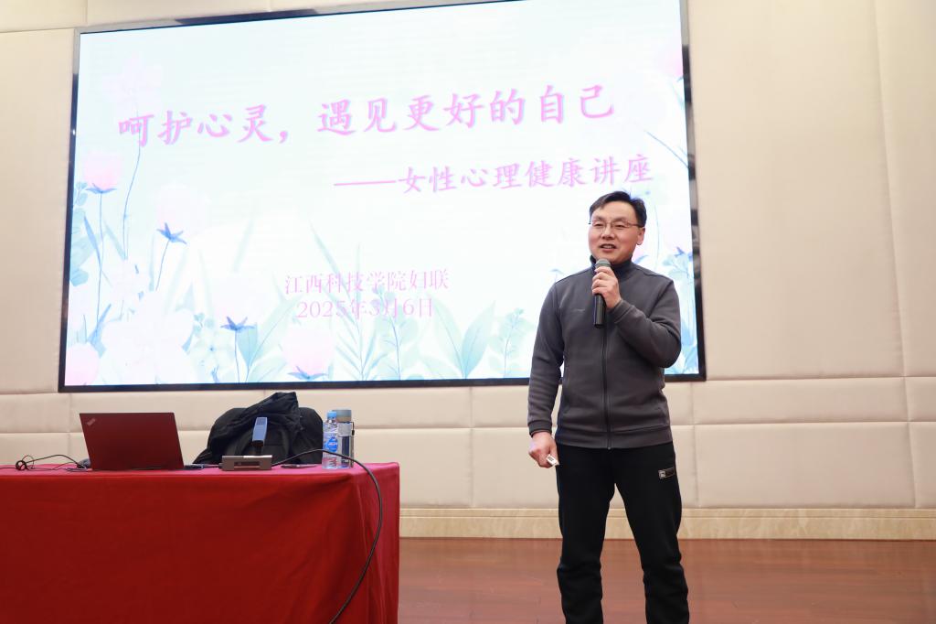 江科网讯(记者 刘莹)3月6日,在第115个“三八”国际妇女节来临之际,校妇联举办“呵护心灵,遇见更好的自己——女性心理健康讲座”。讲座特邀江西师范大学心理学院心理学博士、国家二级心理咨询师沈友田主讲。副校长、工会主席、妇联主席林素君与各分工会女教职工代表共聚一堂,聆听智慧之言,为身心减压赋能。