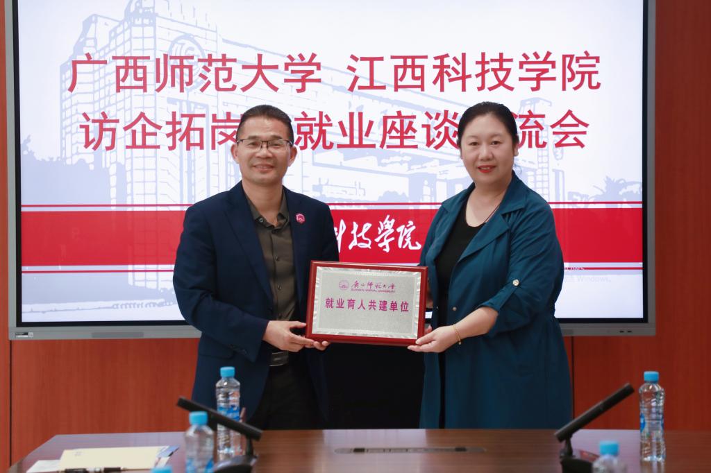 座谈会结束后,李颖部长向我校授广西师范大学就业育人共建单位牌