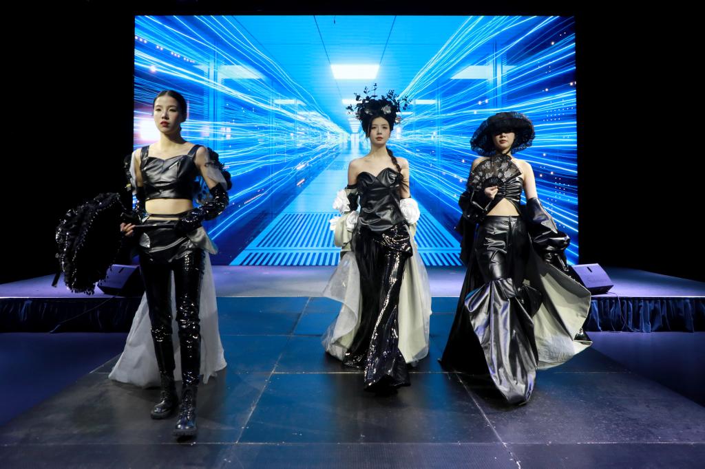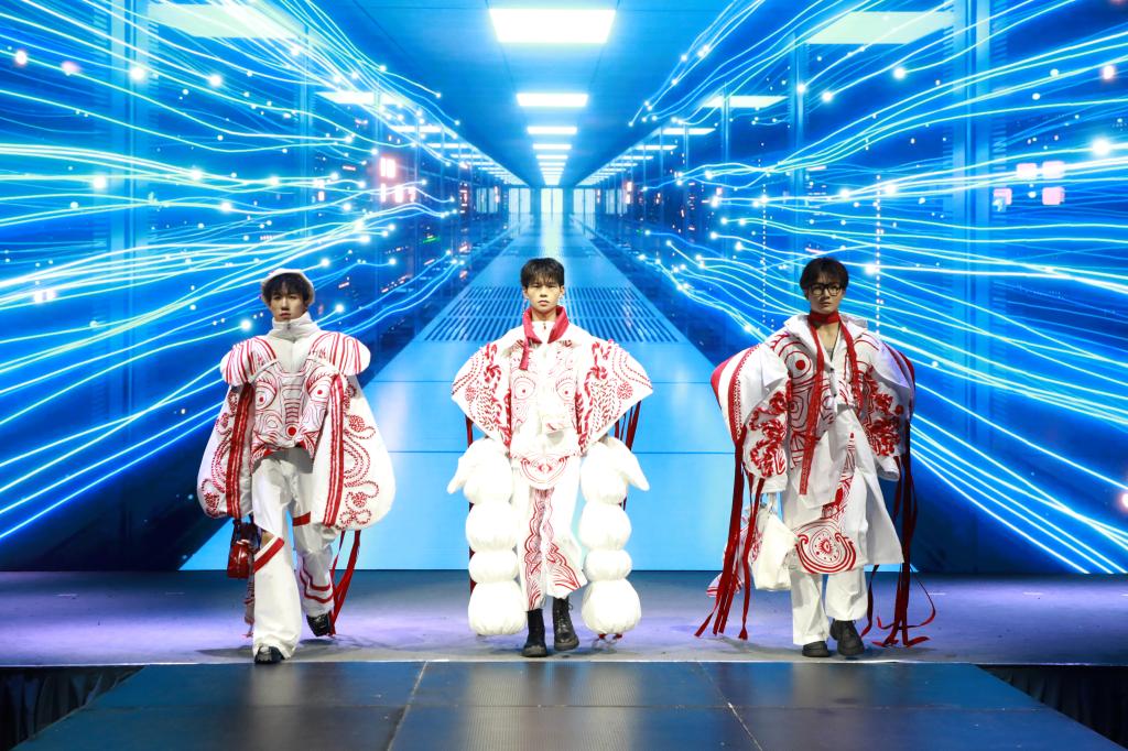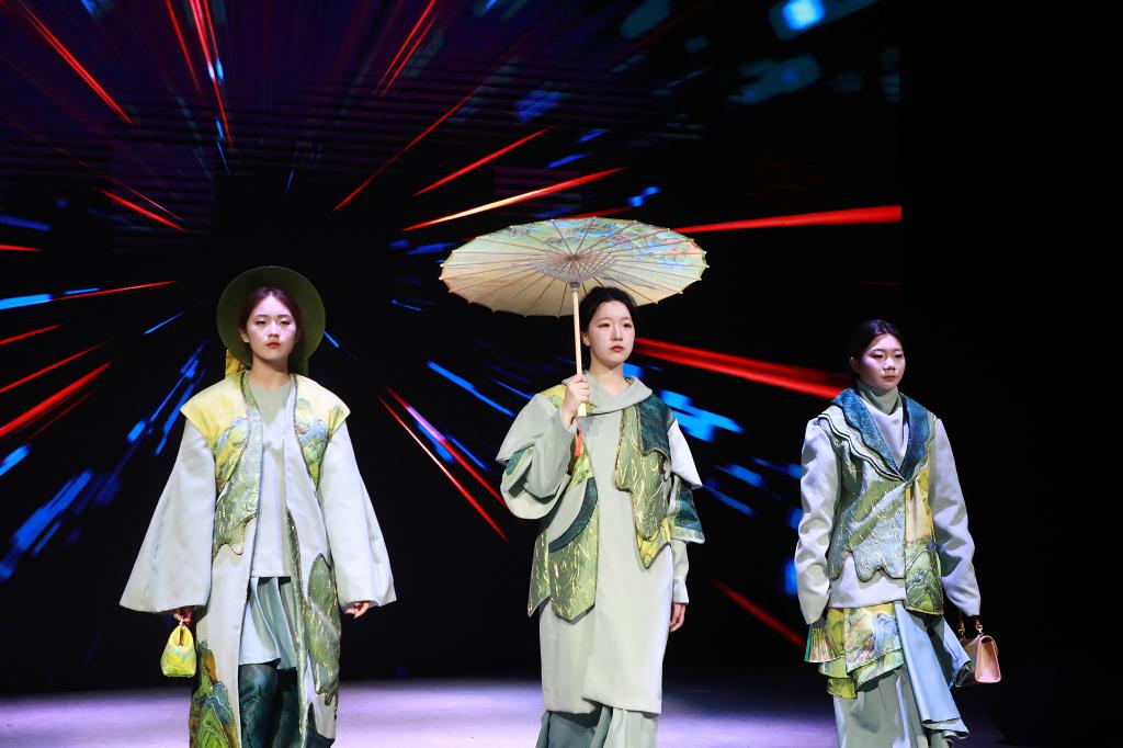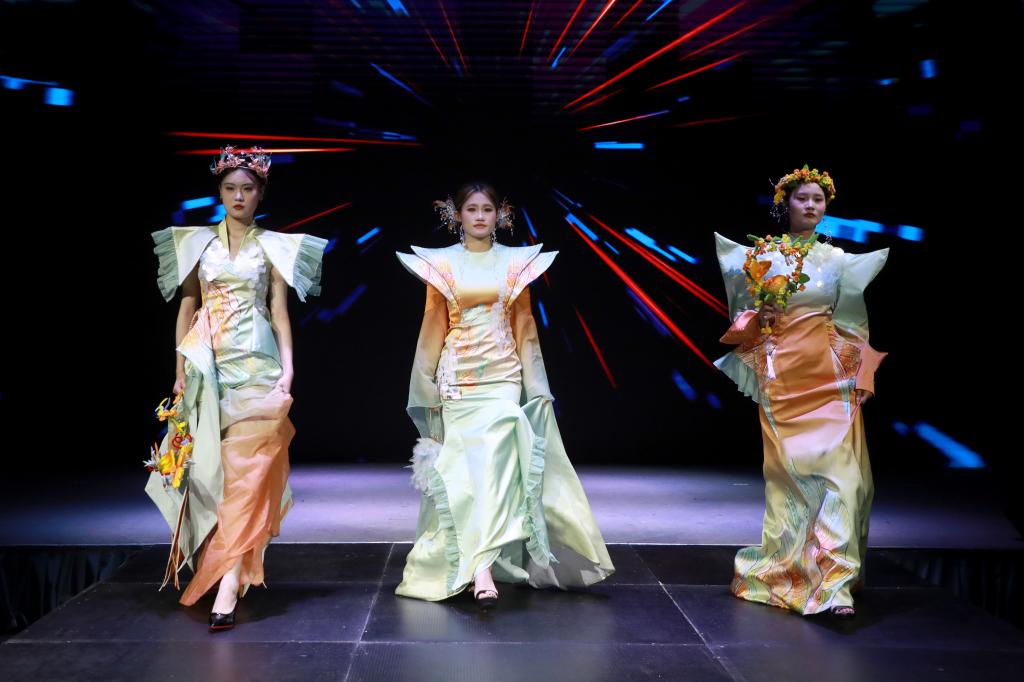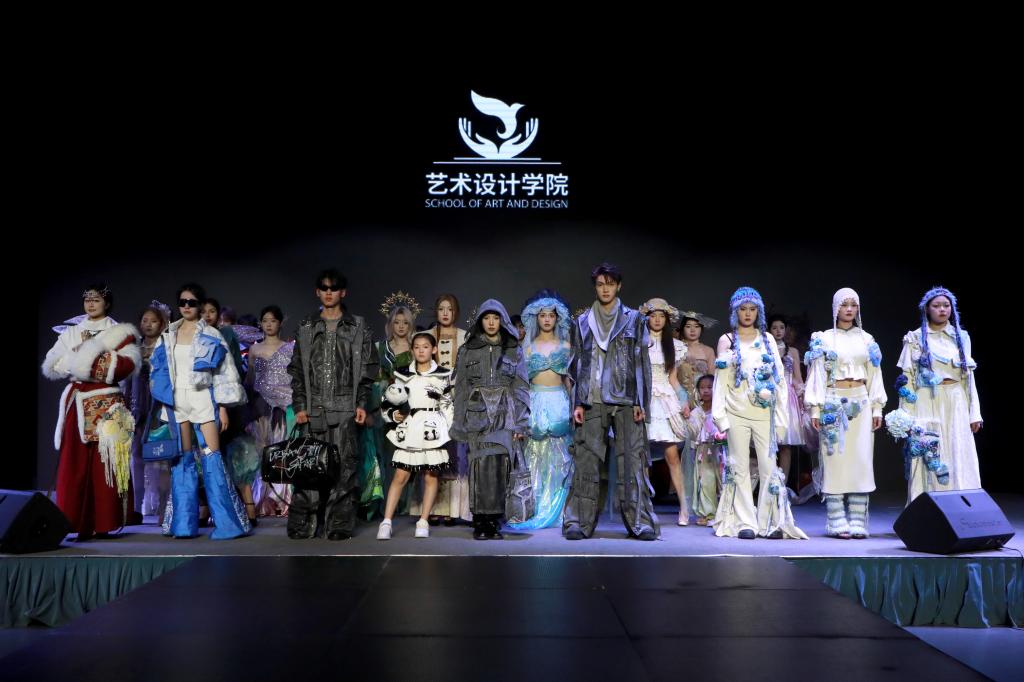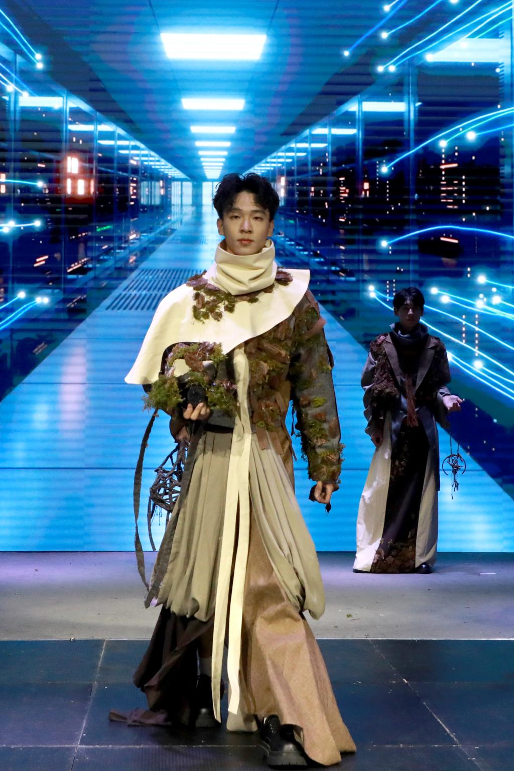 此次动态秀以“经纬”为轴,贯通传统与未来,分上下两场,作品以非遗元素的赛博化演绎、可降解材料的艺术化应用,重新定义传统文化在当代设计中的生命力。上半场展示的作品聚焦非遗活化与工艺创新,将瑶族挑花、非遗剪纸、漂漆染等传统文化与创意设计结合;下半场展示的作品突破时空界限,以三星堆纹样、山海经神兽等神秘元素为灵感,实现解构重塑。171套服装与服饰设计作品涵盖传统非遗、素材解构、环保思潮等类别,全部来自该专业毕业生对时尚和创意的大胆想象,并由他们亲自设计和制作。