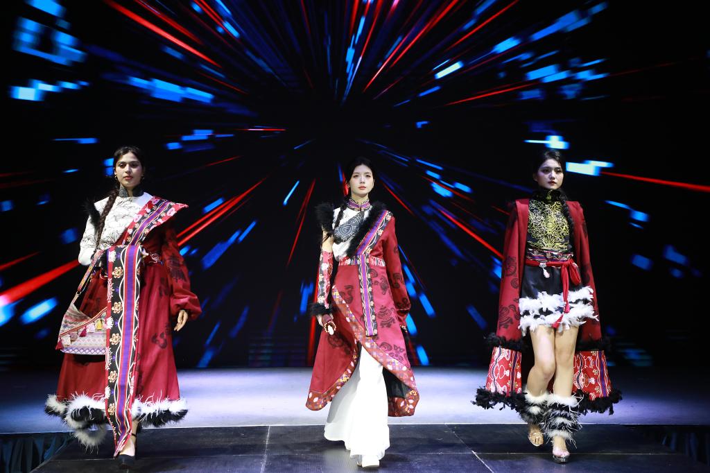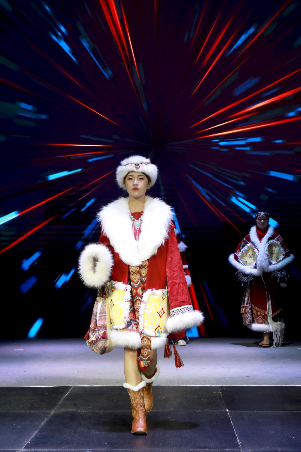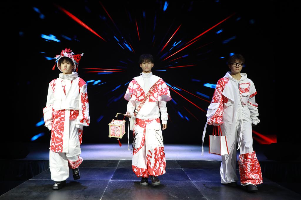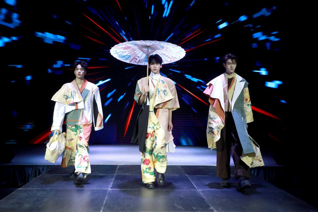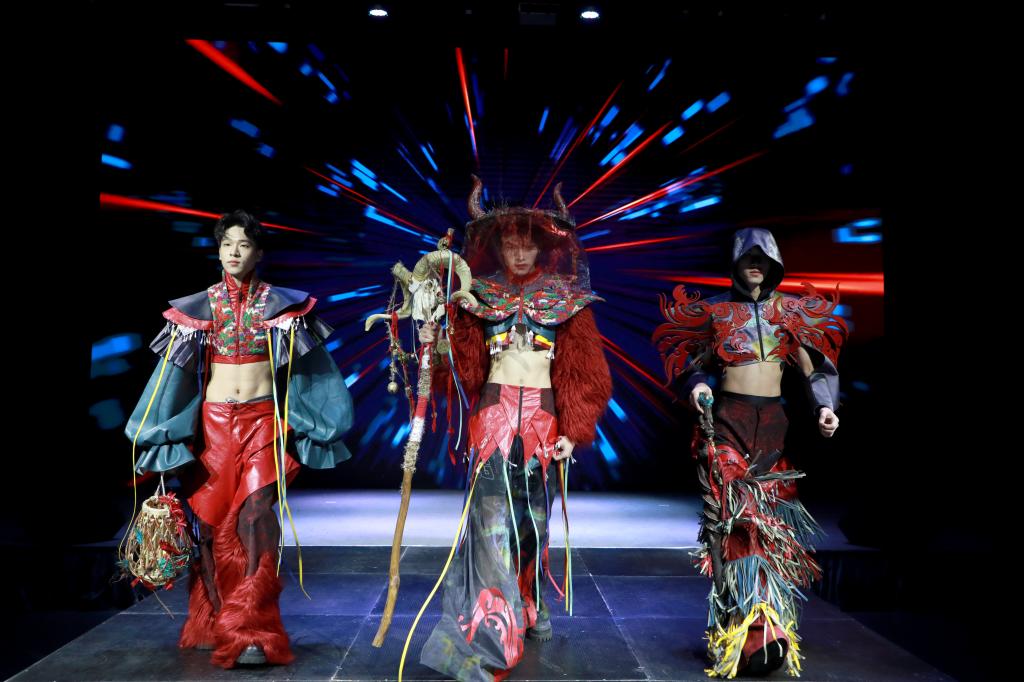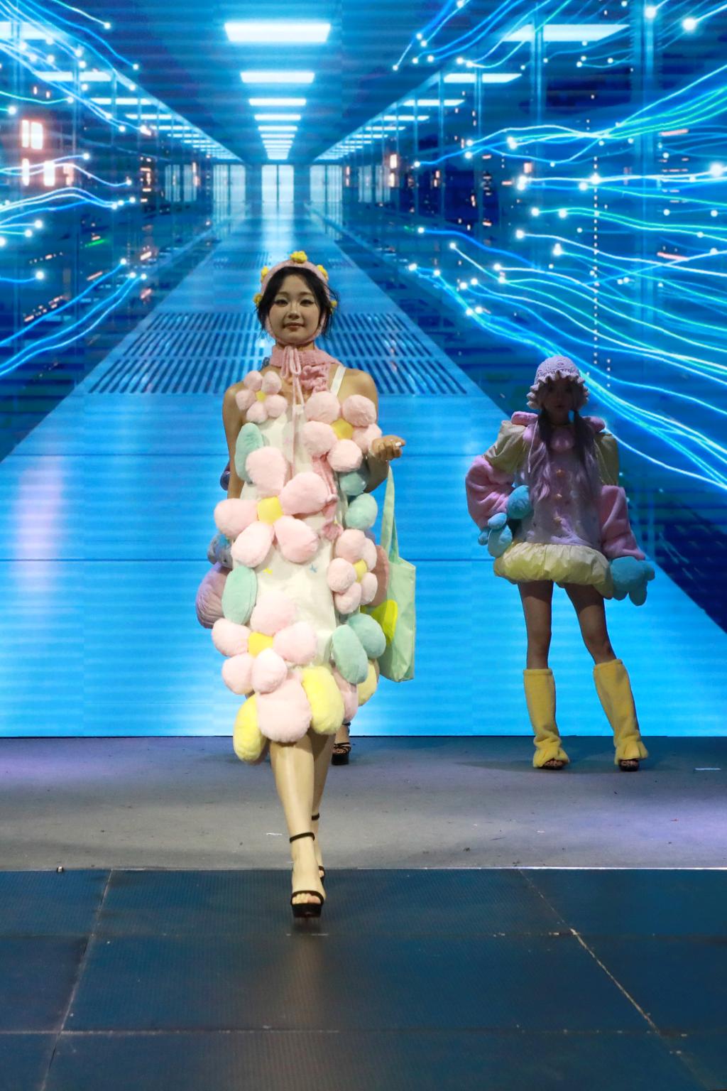 此次动态秀以“经纬”为轴,贯通传统与未来,分上下两场,作品以非遗元素的赛博化演绎、可降解材料的艺术化应用,重新定义传统文化在当代设计中的生命力。上半场展示的作品聚焦非遗活化与工艺创新,将瑶族挑花、非遗剪纸、漂漆染等传统文化与创意设计结合;下半场展示的作品突破时空界限,以三星堆纹样、山海经神兽等神秘元素为灵感,实现解构重塑。171套服装与服饰设计作品涵盖传统非遗、素材解构、环保思潮等类别,全部来自该专业毕业生对时尚和创意的大胆想象,并由他们亲自设计和制作。
