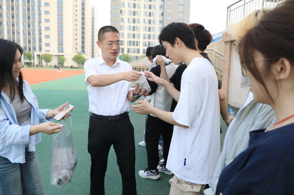 赛前,吕文威副校长亲手将承载着端午祝福的粽子和咸鸭蛋分发到挂点班级学生代表手中,向大家致以节日的问候。他叮嘱大家深刻感悟中华优秀传统文化,在跨文化交流中展现中国青年的风采。同时,他为即将参加旱地龙舟赛的同学们加油助威,期望大家团结协作、奋勇争先,赛出水平、赛出友谊。
