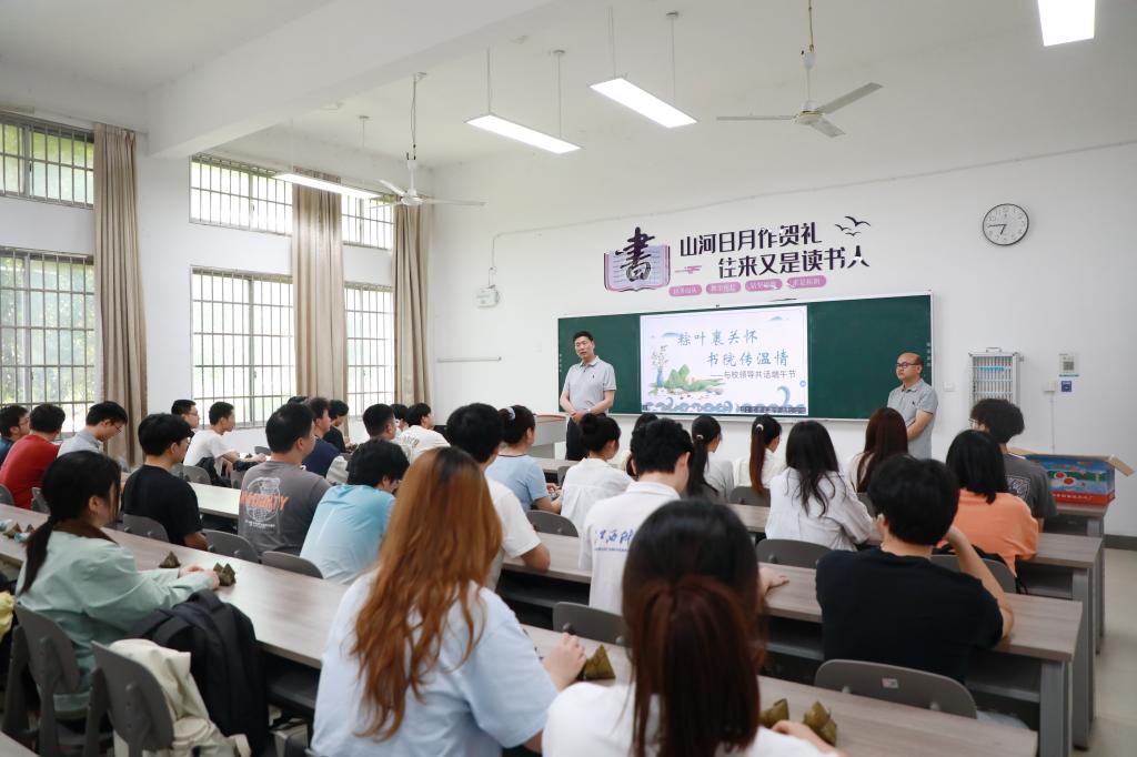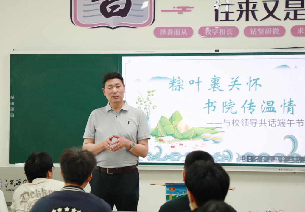 活动中,夏拥华副书记化身思政课堂的“引路人”,为同学们带来了一堂精彩纷呈的思政课。课堂上,他以端午的历史渊源、文化习俗为切入点,从屈原的爱国情怀讲到新时代青年的使命担当,旁征博引、深入浅出,让同学们深刻感受到中华优秀传统文化的深厚底蕴与强大生命力。随后,夏拥华副书记亲切地与同学们展开交流,仔细询问大家的未来职业规划,认真倾听大家的想法与困惑。他鼓励同学们要志存高远,找准人生方向,在大学时光里脚踏实地学好专业知识,以扎实的本领迎接未来挑战,在时代的浪潮中勇立潮头,实现人生价值。