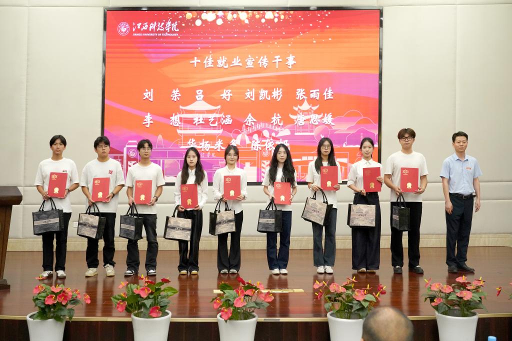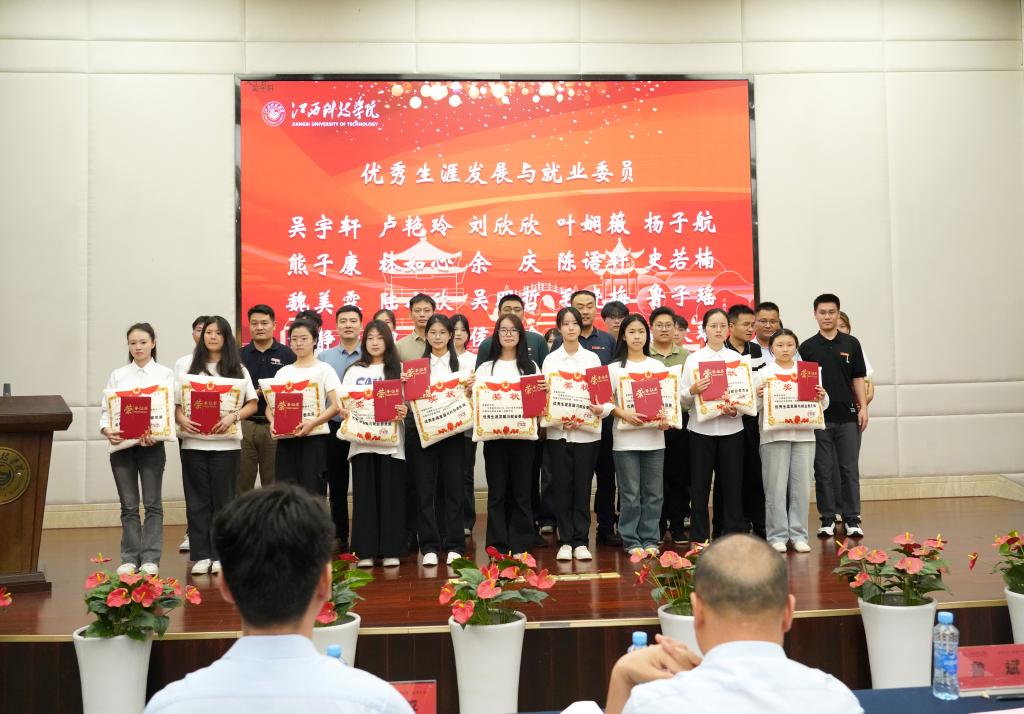 学工处处长鲁斌宣读表彰决定。与会领导向获得2025年“十佳生涯发展与就业委员”“优秀生涯发展与就业委员”“十佳就业宣传干事”“就业宣传标兵”荣誉称号的同学及第二届全国大学生职业规划大赛江西科技学院校赛一、二等奖获奖选手颁奖。