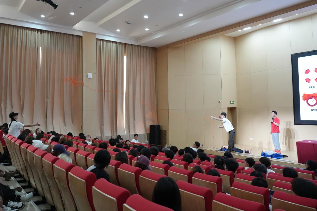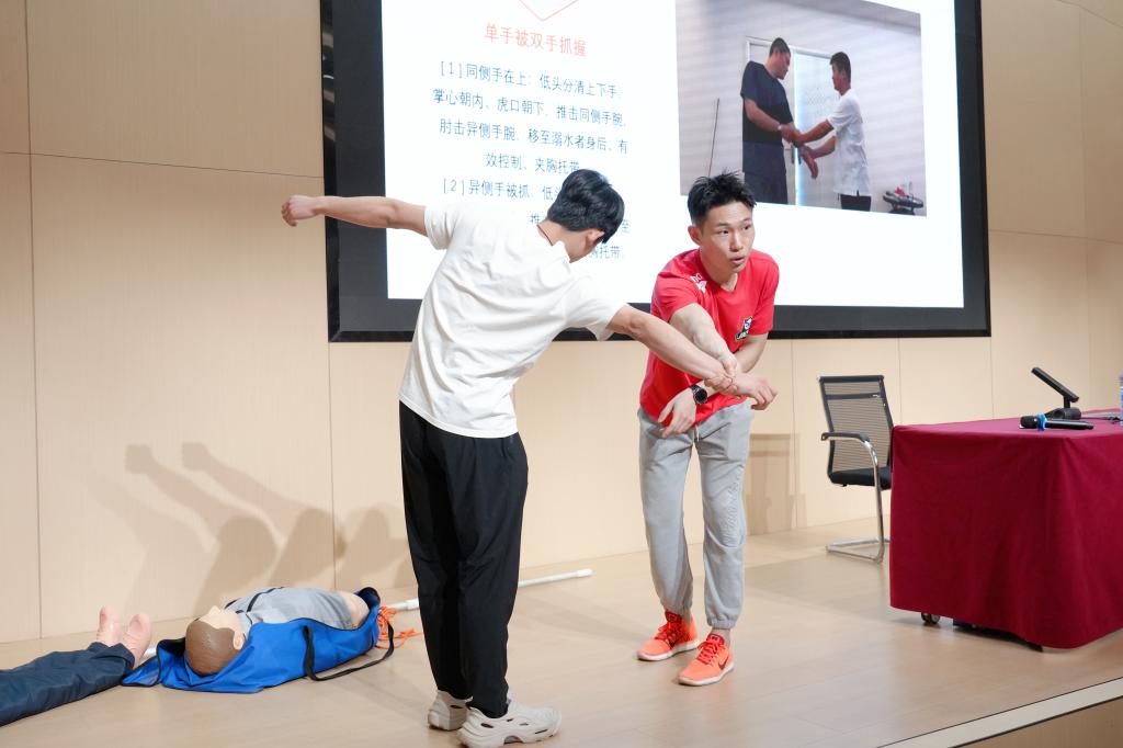周予墨通过播放近年来大学生溺水典型案例视频,揭示“野泳逞能”“盲目施救”“设备缺失”三大致命诱因,并深入剖析溺水事件发生的危害以及严重后果,用真实惨痛的教训敲响防溺水安全警钟。在实操环节,周予墨围绕“介绍救生工具、陆地解脱模仿、心肺复苏等”三个部分,展开分步骤教学。活动现场,学生代表轮流实操,周予墨全程指导,确保每个步骤规范到位,让大家在实践中掌握救命本领。他指出,大学生群体中常见的“手拉手救援”实为高危行为,水流冲击力会瞬间拉倒整组人员,正确做法是利用漂浮物或长杆保持安全距离施救。“当每个同学都能掌握‘1分钟风险评估、3分钟技能响应、5分钟协同救援’的应急逻辑,校园安全防护网才能真正密不透风。”活动最后,罗源昊为参与现场实操的同学送上小礼品,鼓励大家要把防溺水知识和救援本领在记心里,更要传播给身边的人,让每个人都能远离溺水危险。
